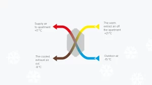 If the ventilation unit blows air into the apartment that is cooler than the room temperature, the supply air is heated by using the building’s own heating system to ensure that the room temperature does not decrease. The lower the set supply air temperature, the less electricity the post-heating radiator will consume. Subsequently, less energy is required from the heating system.