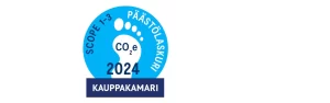 Olemme laajentaneet hiilijalanjäljen laskennan kattamaan sekä suorat että epäsuorat päästöt. Meille myönnetty Keskuskauppakamarin päästölaskurimerkki vahvistaa, että hiilijalanjälki on laskettu GHG-protokollan mukaisesti kattaen Scope 1–3-päästöt. Merkki kertoo sitoutumisestamme läpinäkyvään ja jatkuvasti kehittyvään ilmastotyöhön.